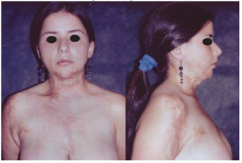 Figura 5 - Caso 2 - Pré-operatório. Vistas de perfil esquerdo e oblíqua direita, mostrando seqüelas de queimadura em face e pescoço.