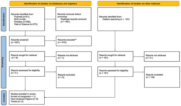 During the evaluation period, which extended up to March 9, 2023, we retrieved 971 records, including 810 from databases and 161 from citation searches. From the records retrieved from the databases, we excluded 189 duplicates. We screened the remaining 621 records, of which 614 were excluded for not meeting the inclusion criteria, resulting in 6 articles, of which 1 was not retrieved, and 5 underwent eligibility assessment. Among the records retrieved from citations, we included 7 in the analysis (►Fig. 1). The final sample consisted of 12 studies, including 1 conference abstract,6 peer-reviewed articles, and 5 theses (►Tables 1-3).1,6,22-31