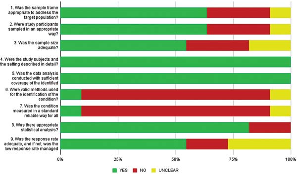 To assess the quality of the articles, two independent reviewers used the 9-item Joanna Briggs Institute (JBI) checklist.17 We did not apply the checklist to conference proceedings. We collected the infection criteria defined in each study. “Unclear” refers to information not provided or of a dubious nature.17 We created a flowchart following the PRISMA guidelines (►Fig. 1)7 and ►Fig. 2 summarizes the quality of the studies according to the JBI criteria.17